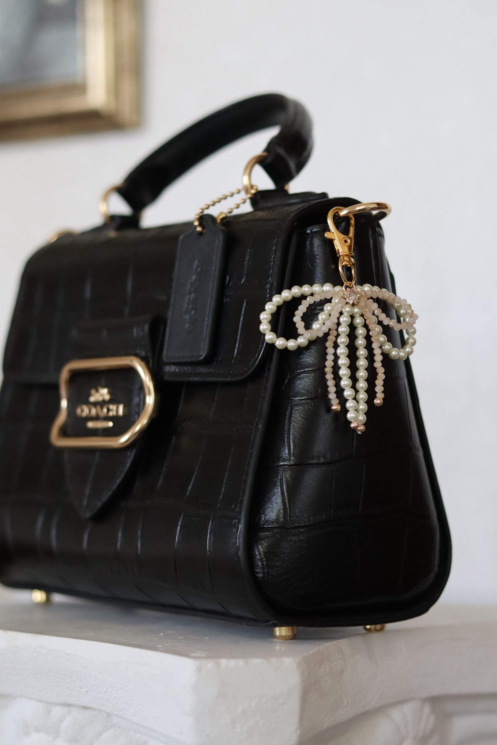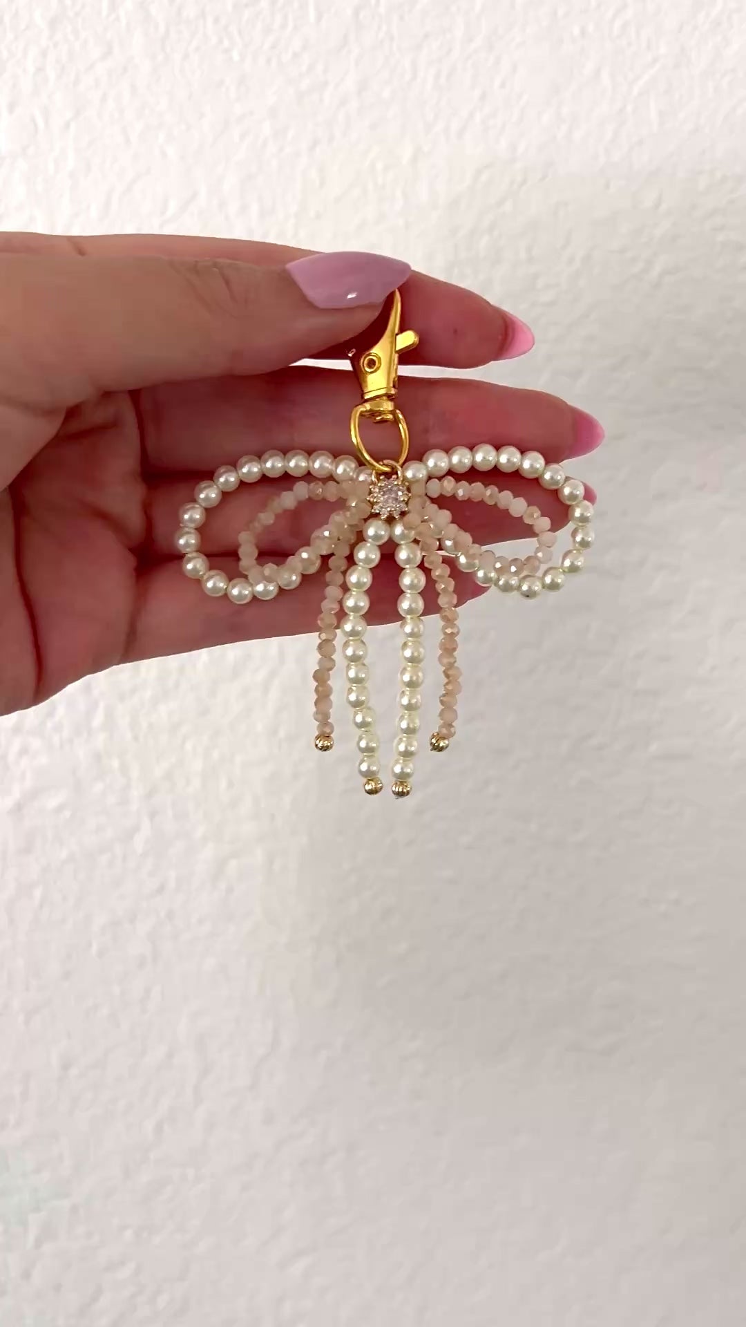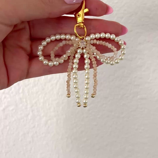 Add a touch of elegance and sparkle to your everyday essentials with the Heavenly Bow Keychain. Crafted with a delicate pearl bow topped by a shimmering crystal bow, this layered design is the perfect mix of chic and whimsical.